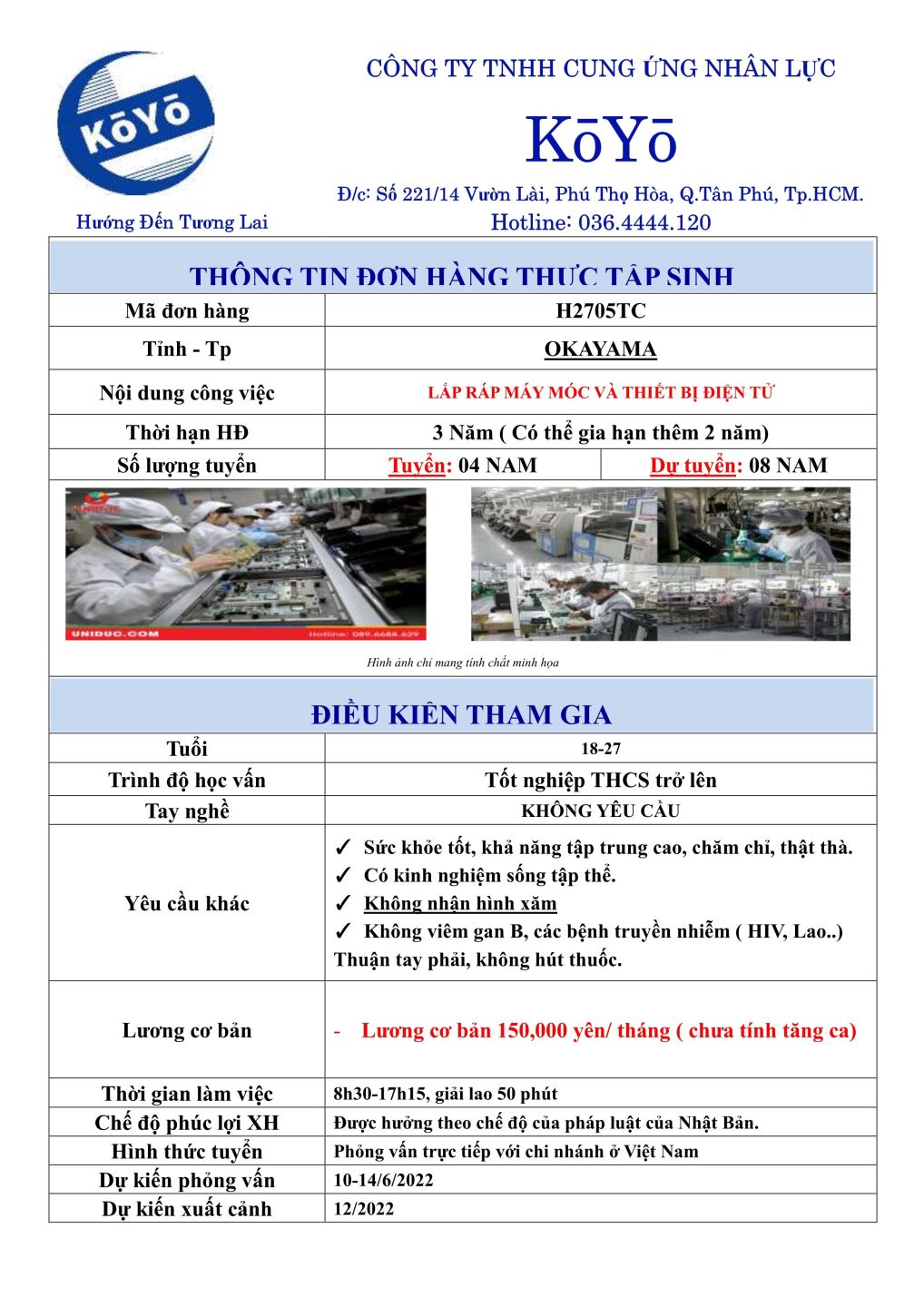 ĐƠN HÀNG LẮP RÁP – OKAYAMA Đăng lúc 30/05/2022 Thuộc mụcĐơn hàng,Đơn hàng thực tập sinh THÔNG BÁO TUYỂN SINH THỰC TẬP SINH NHẬT BẢN ĐƠN HÀNG: LẮP RÁP MÁY MÓC VÀ THIẾT BỊ ĐIỆN TỬ ĐỊA ĐIỂM: TỈNH OKAYAMA GIỚI TÍNH: NAM SỐ LƯỢNG: 04 NAM LƯƠNG CƠ BẢN: 150.000 YÊN (CHƯA TÍNH TĂNG CA) NGÀY PHỎNG VẤN: 10-14/06/2022 Đăng ký – ghi danh: 221/14 Vườn Lài, F. Phú Thọ Hòa, Q. Tân Phú, Tp. Hồ Chí minh Facebook:https://www.facebook.com/koyo.xuatkhaulaodong Wepsite: https://www.koyohr.vn/ Hotline: 036 4444 120 – Mrs Nương