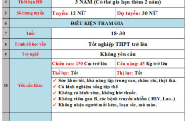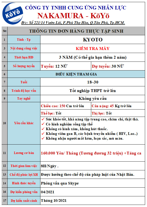 ĐƠN HÀNG KIỂM TRA MÁY Đăng lúc 25/03/2021 Thuộc mụcĐơn hàng,Đơn hàng thực tập sinh THÔNG BÁO TUYỂN SINH THỰC TẬP SINH XKLD NHẬT BẢN: ĐƠN HÀNG: KIỂM TRA MÁY ĐỊA ĐIỂM: TỈNH KYOTO GIỚI TÍNH: NỮ SỐ LƯỢNG: 12 NỮ LƯƠNG CƠ BẢN: 160,000 YÊN/THÁNG + TĂNG CA NGÀY PHỎNG VẤN: THÁNG 04/2021 Đăng ký – ghi danh: 221/14 Vườn Lài, F. Phú Thọ Hòa, Q. Tân Phú, Tp. Hồ Chí minh Facebook:https://www.facebook.com/koyo.xuatkhaulaodong Wepsite: https://www.koyohr.vn/ Mẫu đăng ký Online:https://forms.gle/V3tTNfxPscjisaSF6 0343439679 ( Mr. Thanh) + Zalo /